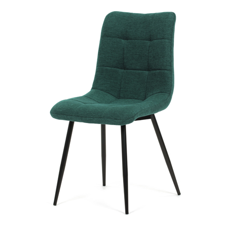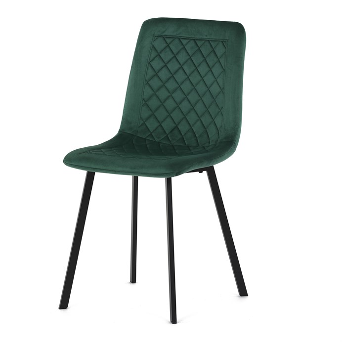 Moderná jedálenská stolička je potiahnutá do hebkého zamatu v zelenej farbe. Elegantné štvorcové prešitie vo farbe poťahového materiálu. Podnož je prevedená v nástreku čierneho polomatného laku. Nohy majú kruhový profil. Len osobný odber